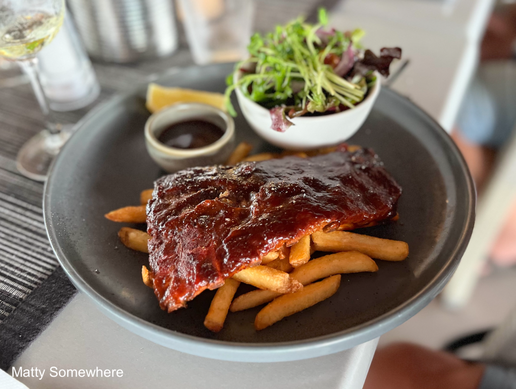 My good friend Ron orders the half rack of pork ribs, hickory-basted and served with fries and a side salad. It looks more like a full rack, and he declares it absolutely delicious, the smokiness of the basting the standout feature. Luckily, a takeaway box comes in handy for the leftovers he enjoys later for dinner.