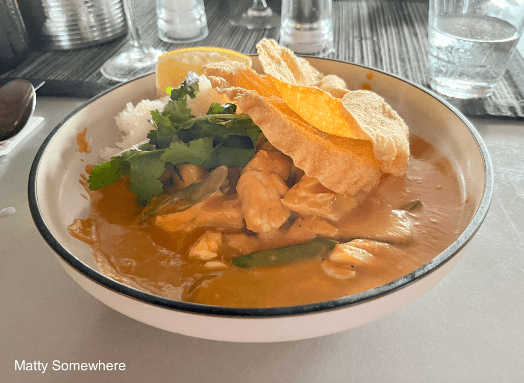 I opt for the Thai Penang curry with fish, a slightly sweet and salty red coconut broth served with steamed rice. The dish comes with crispy pappadums and a refreshing mango salsa, adding a tropical twist to the rich, aromatic curry. I’m not usually a curry aficionado, but this is delightful!