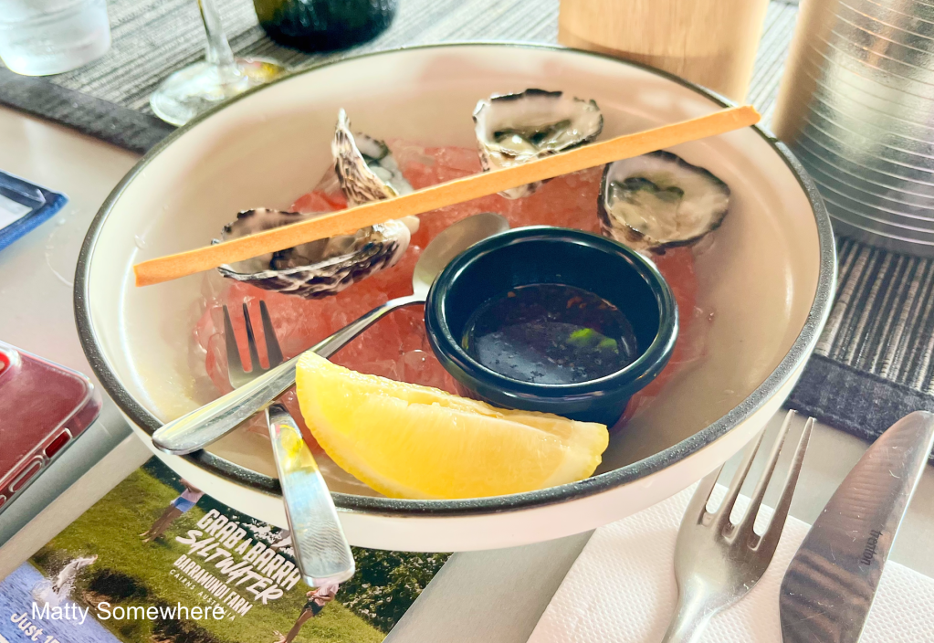 Ron and Matt are struggling to find a parking spot, but Cath and I are too hungry to wait, so we start with some oysters. We’re not told where they’re from, but given their smaller size, I’m guessing they’re Sydney Rock Oysters, alas I find out later they are and from the Hawkesbury Region of New South Wales. They come with a soy, ginger, and lime dipping sauce that adds a fresh, zesty kick. We both agree we should have ordered another four or six…
