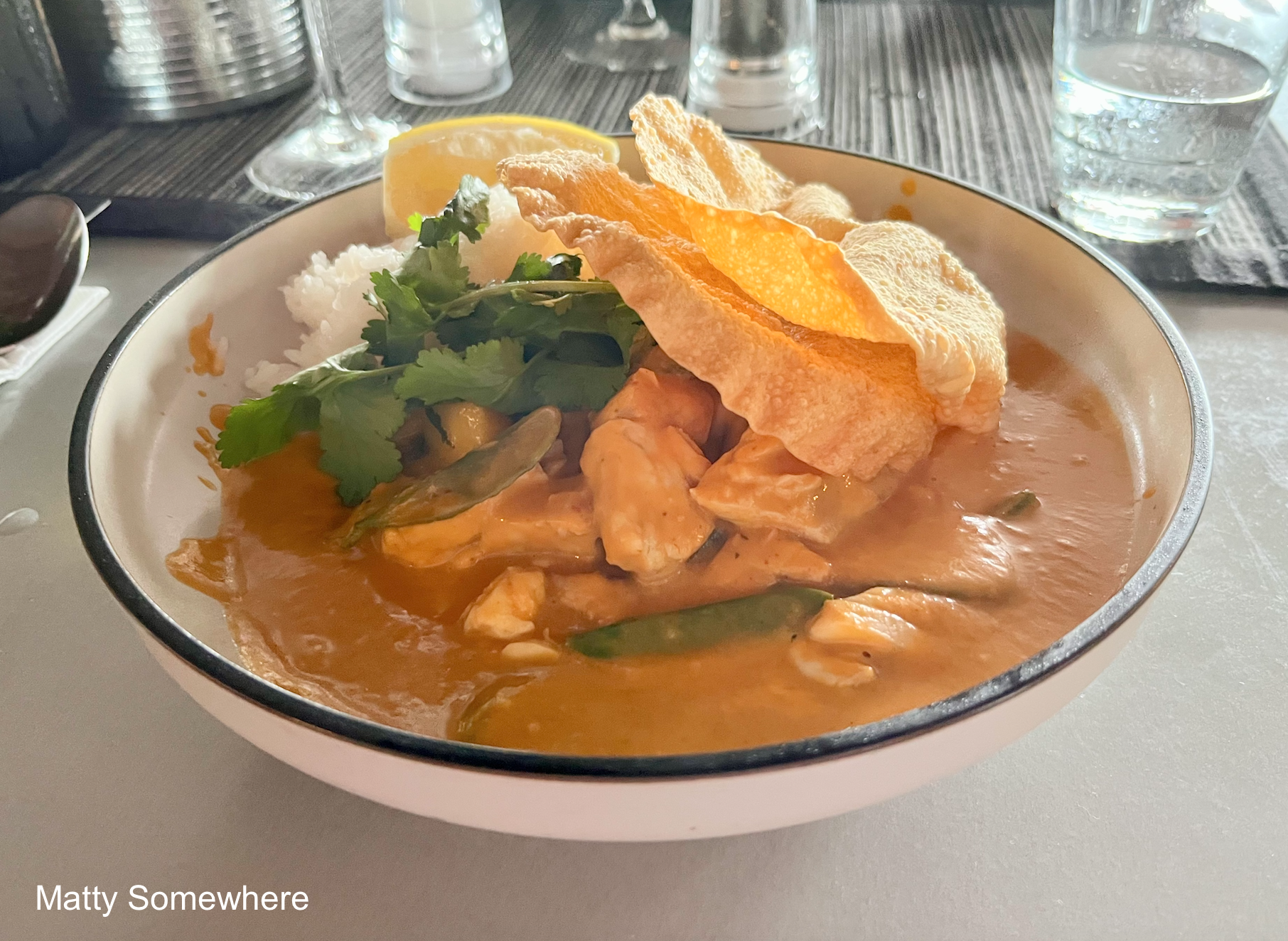 I opt for the Thai Penang curry with fish, a slightly sweet and salty red coconut broth served with steamed rice. The dish comes with crispy pappadums and a refreshing mango salsa, adding a tropical twist to the rich, aromatic curry. I’m not usually a curry aficionado, but this is delightful!