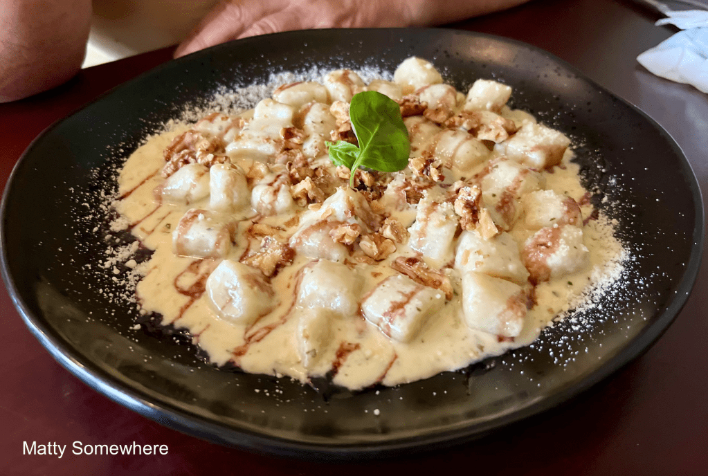 Rosemary choose the gnocchi with gorgonzola, and I couldn’t help but feel a bit of food envy. The red wine reduction drizzled over the dish was delightful, cutting through the rich gorgonzola and creamy base with a perfect touch of acidity. The crunchy toasted walnuts added a touch of earthiness while the gnocchi themselves were freshly made, perfectly bouncy, and tasted just like something any great Nonna would make.