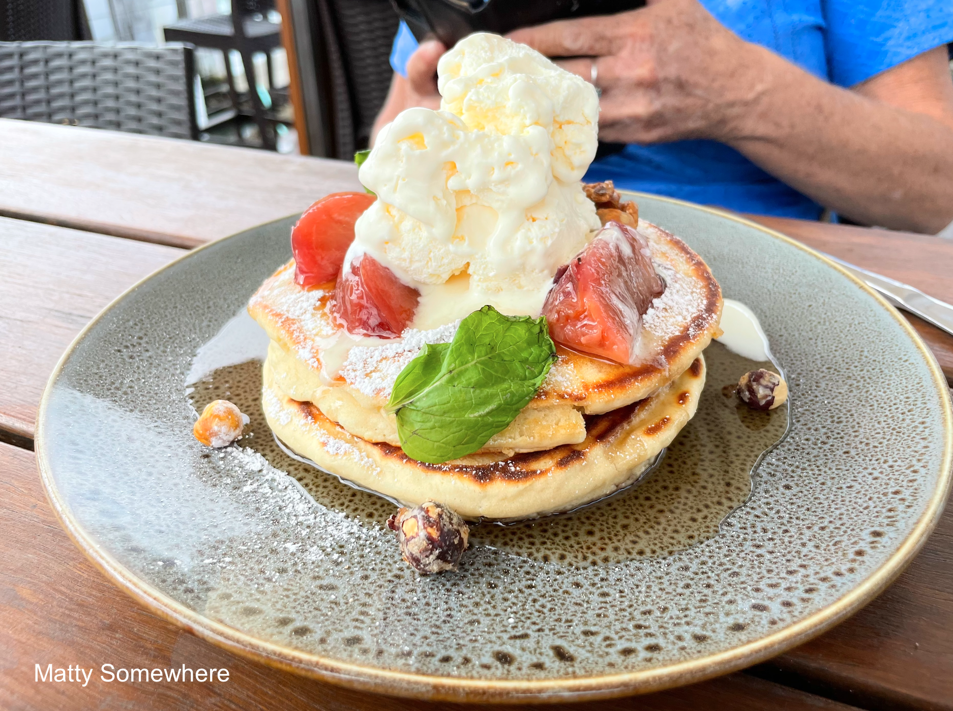 Shanny goes for the super good looking pancakes topped with fresh strawberries, honey and cream with candied walnuts. I nab a bite and the pancakes are nice and fluffy.