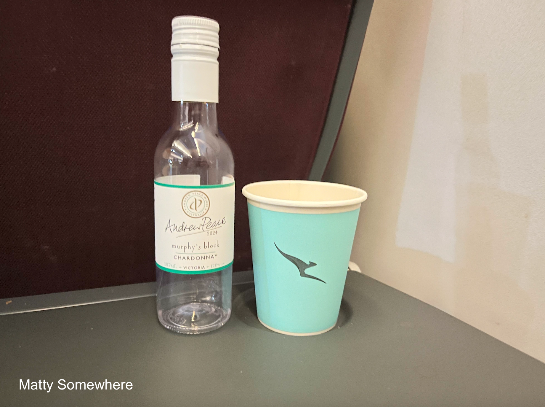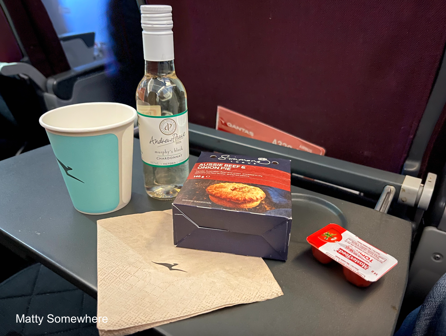 Simmone Logue Fine Food Company has long partnered with Qantas, supplying handmade gourmet items such as artisanal beef sausage rolls and pies. Her Aussie products feature in domestic menus, reflecting Qantas’s commitment to quality Australian ingredients and enhancing passengers’ in-flight dining experience. We are all served a Simmone Logue good old Aussie Beef and Onion meat pie with a portion of tomato sauce (I didn’t hear if there was a vegetarian option…) There was a choice of drinks and I went for an Andrew Murphy Block Chardonnay from Victoria.