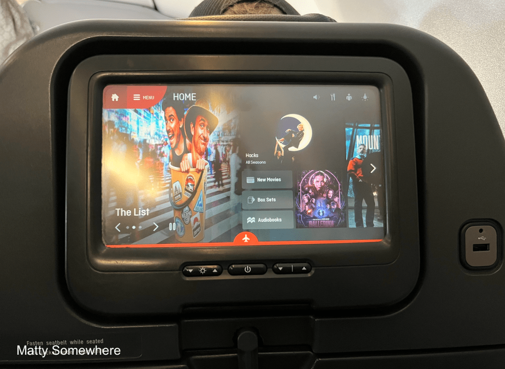 The Airbus A330-200 features seatback TVs with the Panasonic eX2 in-flight entertainment system, offering hundreds of hours of content. I settle in with an episode of The Inspired Unemployed: The List, which has me laughing out loud. Other options include new releases like Mission Impossible and popular box sets such as The Gilded Age and 1923.