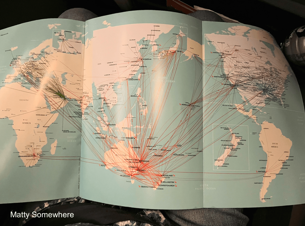 …and what I particularly love is the route map! It not only highlights the routes QANTAS operates but also showcases connections available through their OneWorld partners, including Emirates and American Airlines.