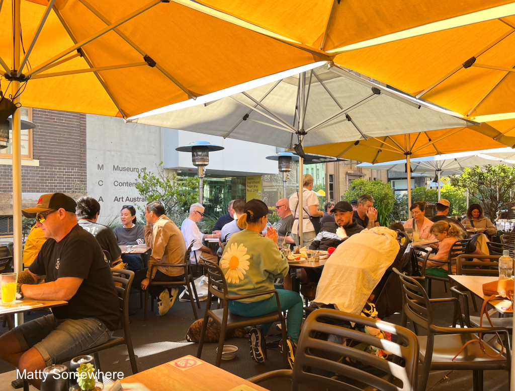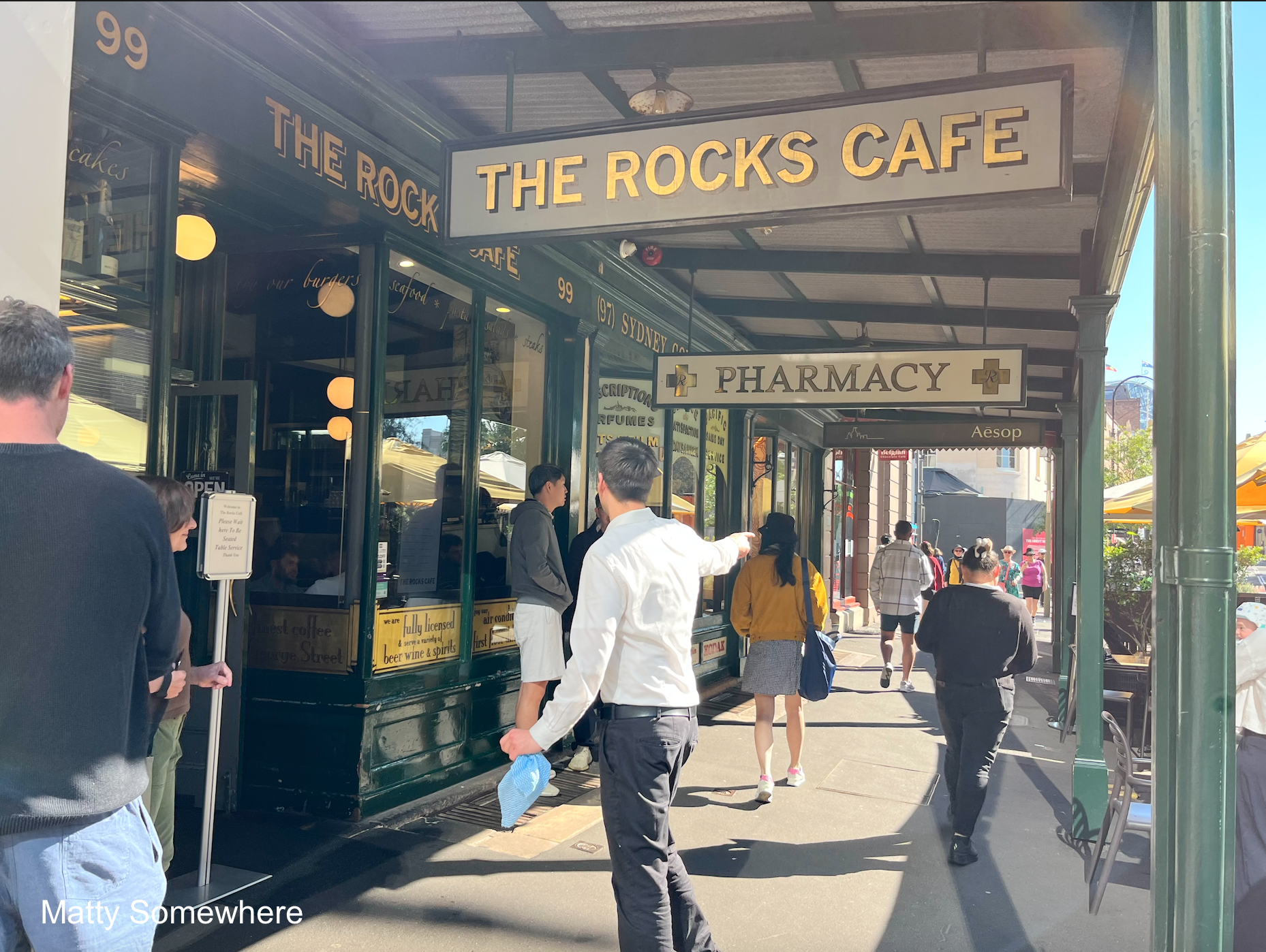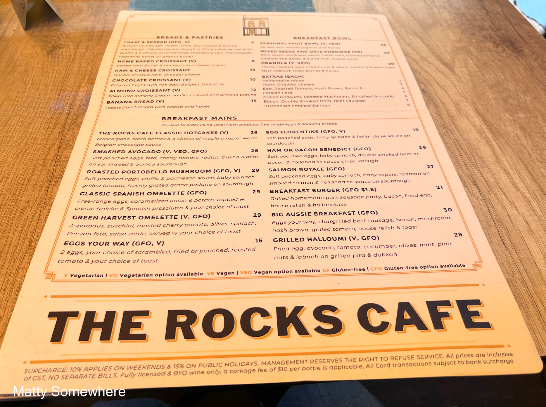 Breakfast at The Rocks Café in Sydney is a delightful experience, with hearty classics, fresh coffee, and a charming heritage setting, making it the perfect spot to start your day in this historic entertainment and dining precinct. I am here meeting my friend Susanne for breakfast after a very early shift at work, and we are both starving!