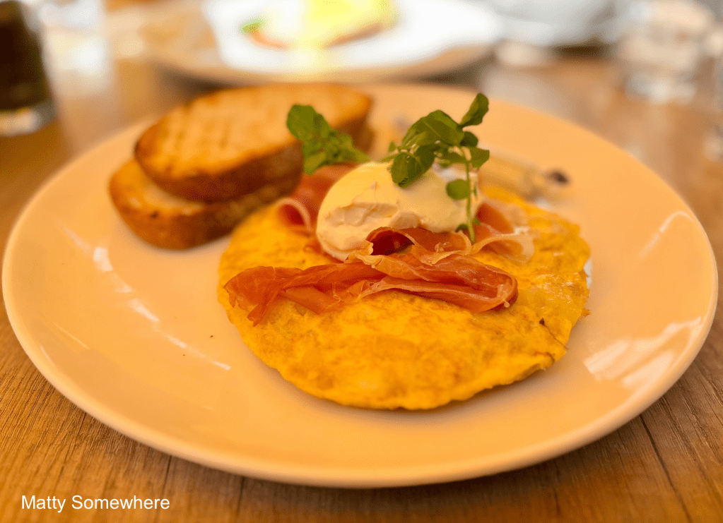 I order the Classic Spanish Omelette, though it wasn’t quite what I expected. I’d imagined something like the Spanish tortillas I enjoyed in Spain (oh, those were incredible!), quartered from a large pie shaped dish. Instead, this was more of a personal omelette, with chunks of potato, topped with Jamón (prosciutto) and a dollop of crème fraîche. The toasted sourdough was a highlight, especially paired with La Conviette salted butter, simple, rich, and very delicious.