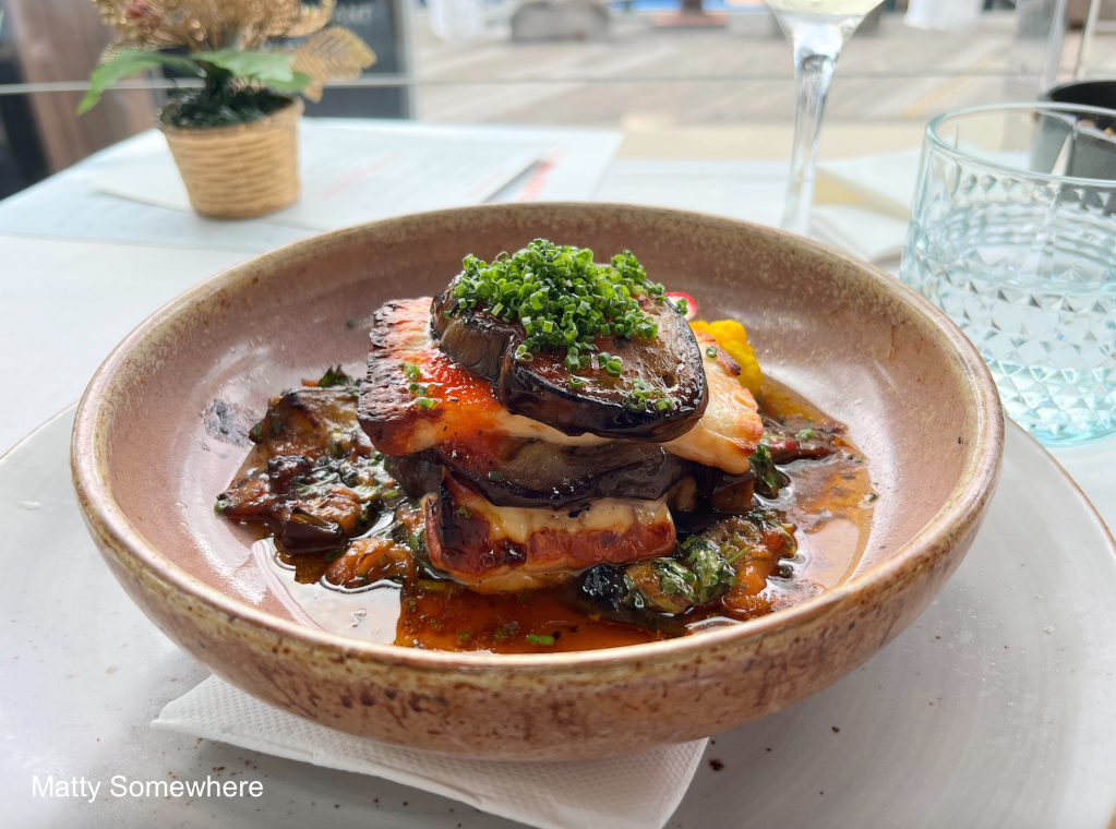 The halloumi and smoked eggplant is an ideal shared dish, beautifully layered with smoky eggplant, Riverina halloumi, chilli jam, and cold-pressed olive oil. The chilli jam enhances rather than overwhelms, letting each flavour shine. I especially love the halloumi’s crisp edges underneath the soft, luscious, smokey eggplant .