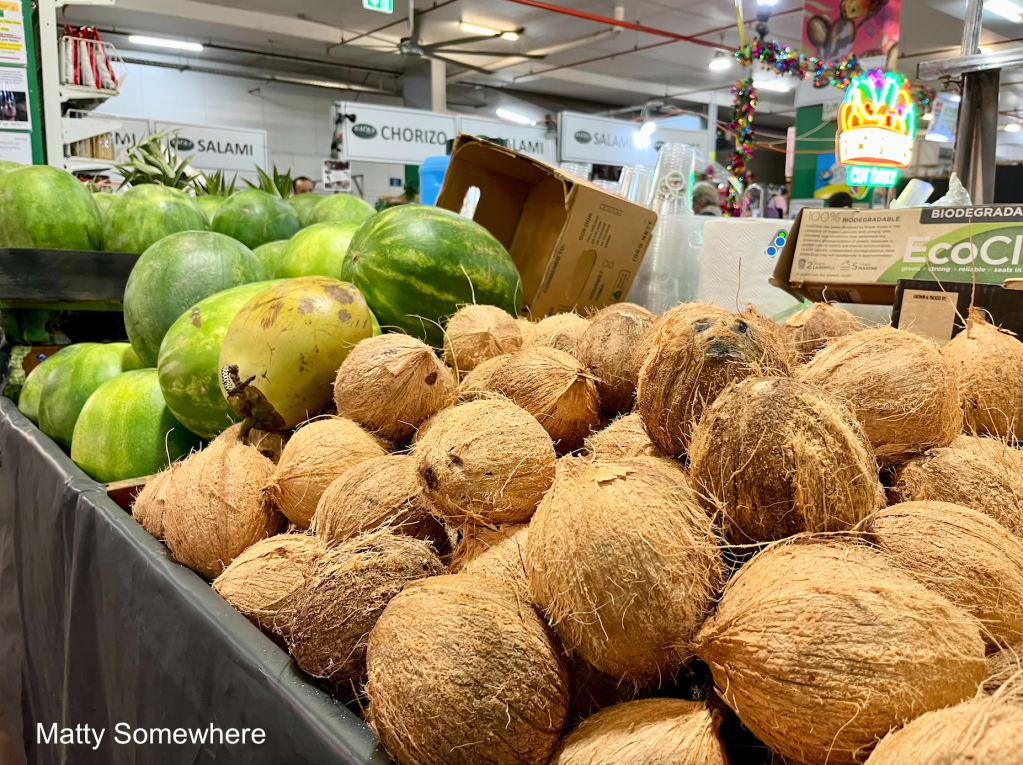 Of course, what tropical market wouldnt have coconuts and watermelons for sale?