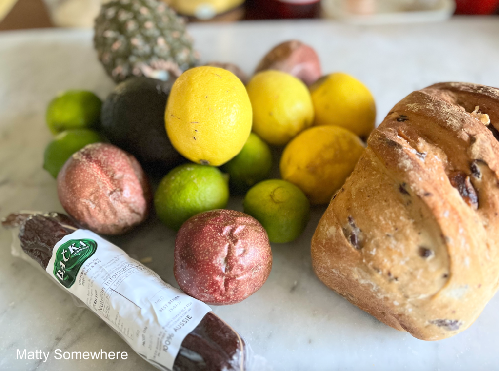 So here is my haul from my last visit, four lemons ($2), four limes ($2), four passionfruit ($3), a pineapple ($5), beef, kangaroo and emu salami ($15) and from the same stall a loaf of garlic and olive bread ($5), which had large soft chunks or garlic and olives. It was delicious just lightlyu toasted with some butter!