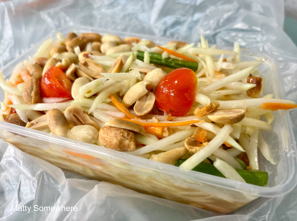 I opt for no chilli to be added but it has snake beans, mung beans, a few cherry tomato halves and roasted peanuts. The fish sauce and lime make it fresh, zesty, and bursting with flavour, it’s the perfect refreshing dish to enjoy in the warmth of the tropics.
