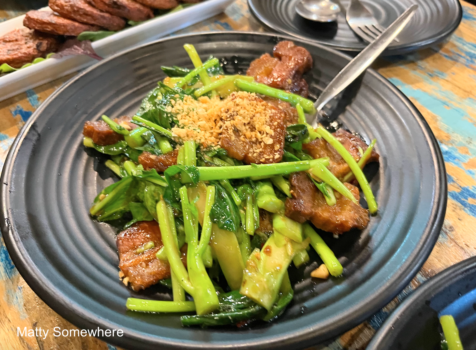 Ka Na Moo Krob combines crispy pork belly with tender Chinese broccoli in a savoury stir fry. The dish delivers a satisfying contrast of textures, enriched by garlic and soy, while fresh chilli adds a lively heat. The pork is crispy yet tender and the greens are gorgeous!
