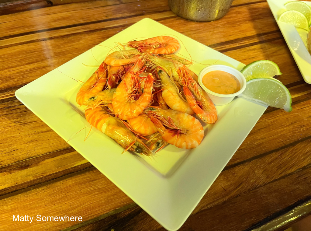 We choose two dishes to share: a platter of mixed prawns and a serving of bugs, both fresh, simple, and perfect for enjoying together.